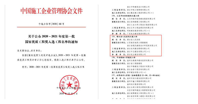 12月1日,中國施工企業管理協會公布了2020~2021年度第一批國家優質工程獎入選工程名單,中立建設承建的縉云縣人民醫院遷建工程榜上有名。這是公司獲得的第一個國家優質工程獎項目,也是麗水市本地企業第一個獲國家優質工程獎項目。